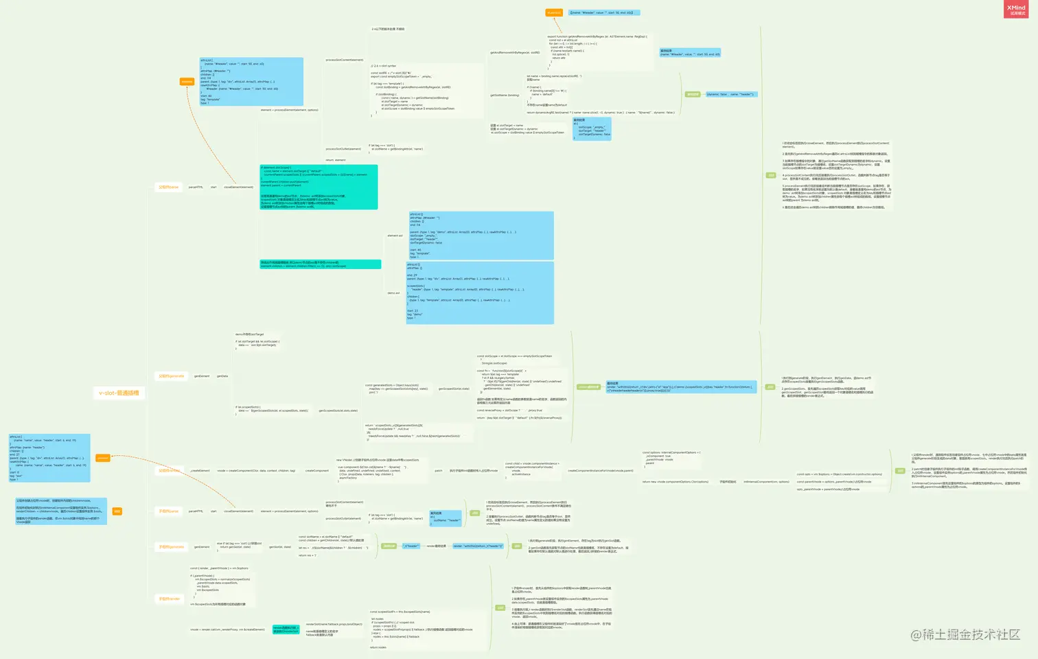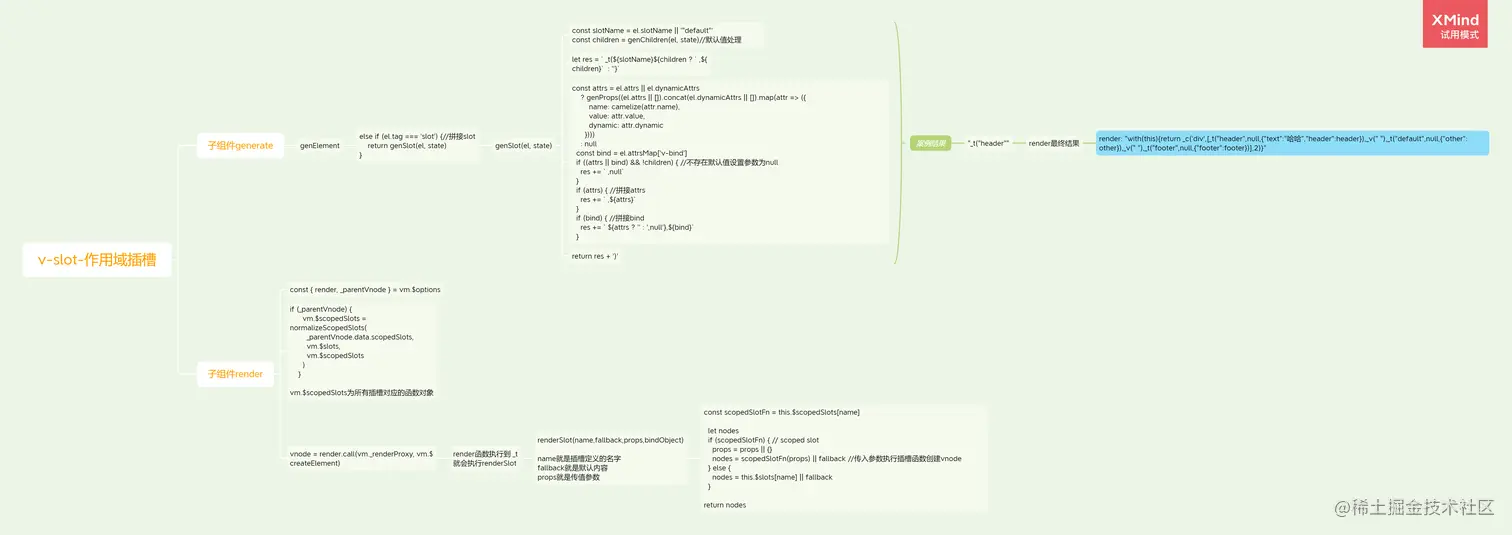 作用域插槽与普通插槽最大的不同就是子组件generate阶段,会对标签的attrs属性和bind指令进行处理,生成的渲染函数会有不同。然后在render阶段接收到传入参数执行插槽函数。