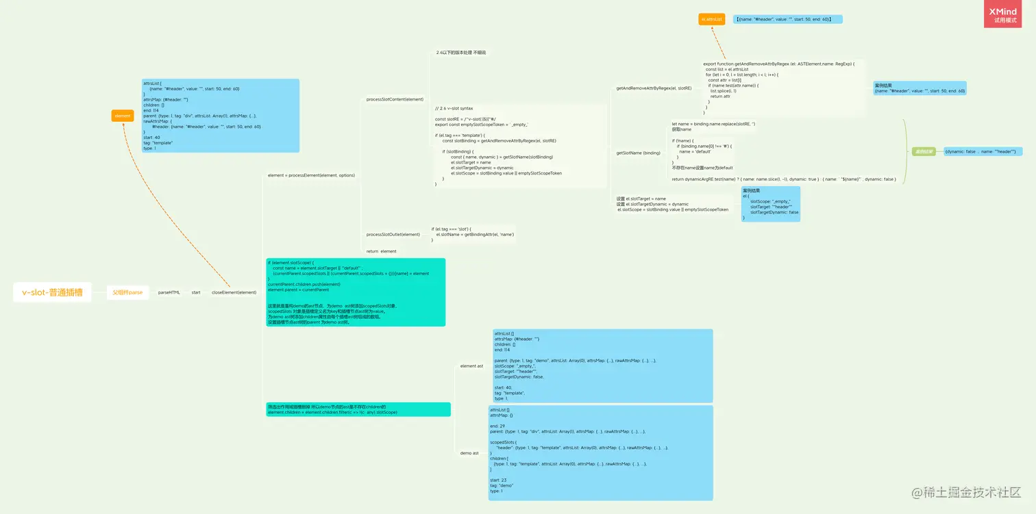 5.processElement执行完后接着会判断当前插槽节点是否存在slotScope,如果存在,获取插槽的名字,如果没有名字就设置为默认值default,接着就是重构demo的ast节点,为demo ast树添加scopedSlots对象,scopedSlots 对象是插槽定义名为key和插槽节点ast树为value。为demo ast树添加children属性由每个插槽ast树组成的数组。设置插槽节点ast树的parent 为demo ast树。