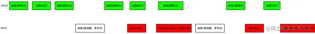 但 CPU0 上的线程 B 可能又马上获取到了 GIL,这就导致其他 CPU 上被唤醒的线程,只能眼巴巴地看着 CPU0 上的线程愉快地执行着,而自己只能等待,直到又被切换到待调度的状态,这就会产生多核 CPU 频繁进行线程切换,消耗资源,这种情况也被叫做「CPU颠簸」。整个执行流程如下图: