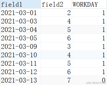 知道这个结果后,我们可以得知,每个周的第2-6天是对应我们的工作日,那么我们可以取这个结果IN (2,3,4,5,6) 也可以 NOT IN (1,7)。