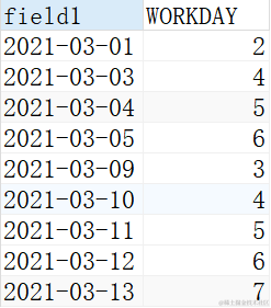 这里的DATEPART的功能主要是用来返回这一天是这个星期的第几天,我们的系统日历是按照美国的历法,每周的第一天是星期日,所以2021-03-01的星期一是本周的第二天,以此类推,我们得到每一天对应在本周的第几天。