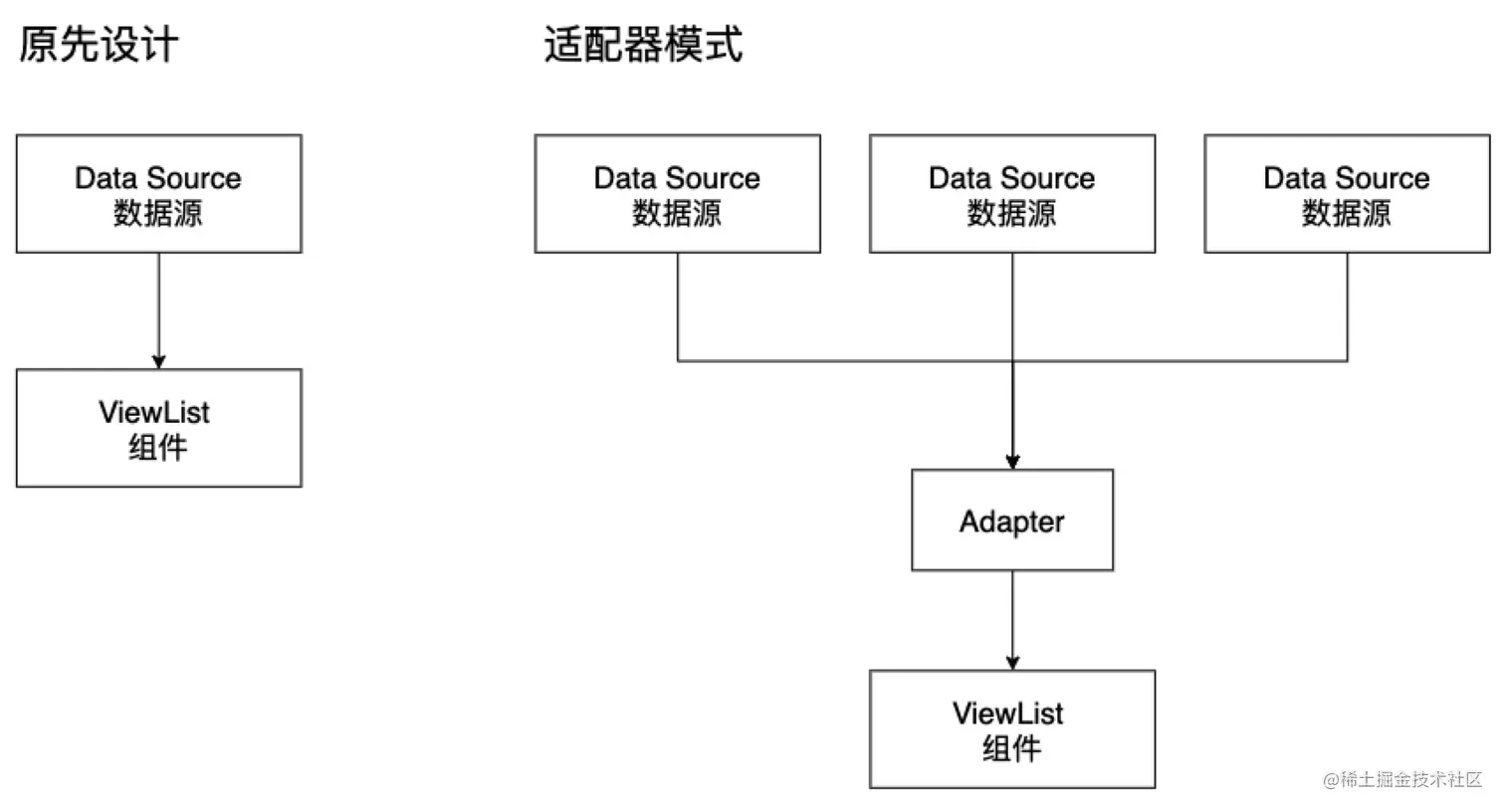 在数据进行组件列表展示时,将来源不同的数据经过适配器处理,进行整合,然后传递给 <ViewList /> 展示组件,以达到我们的目的