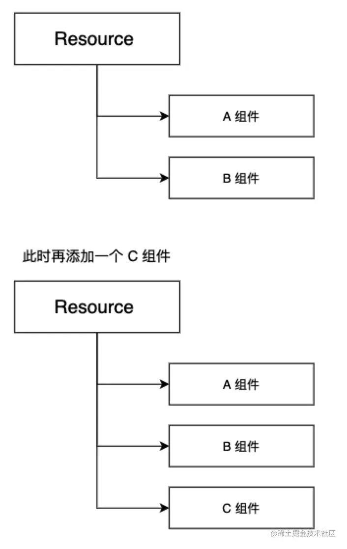 从组件层级来看,Resource 是向下依赖子组件(依赖关系向下),此时需要新增C组件,可能还需要针对 C 组件进行一些特定的兼容。将来如果子组件类型增多,意味着需要频繁修改 Resource 内部逻辑!!!