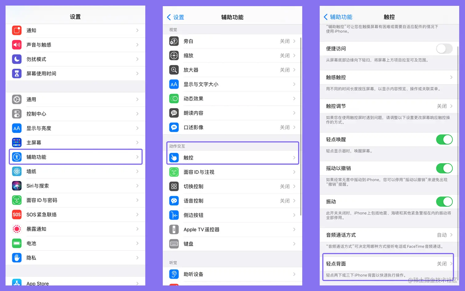 路径依次为:打开设置、选择「辅助功能」、在「动作交互」中选择「触控」、在最下方找到「轻点背面」,可根据个人喜好选择「轻点两下」或「轻点三下」