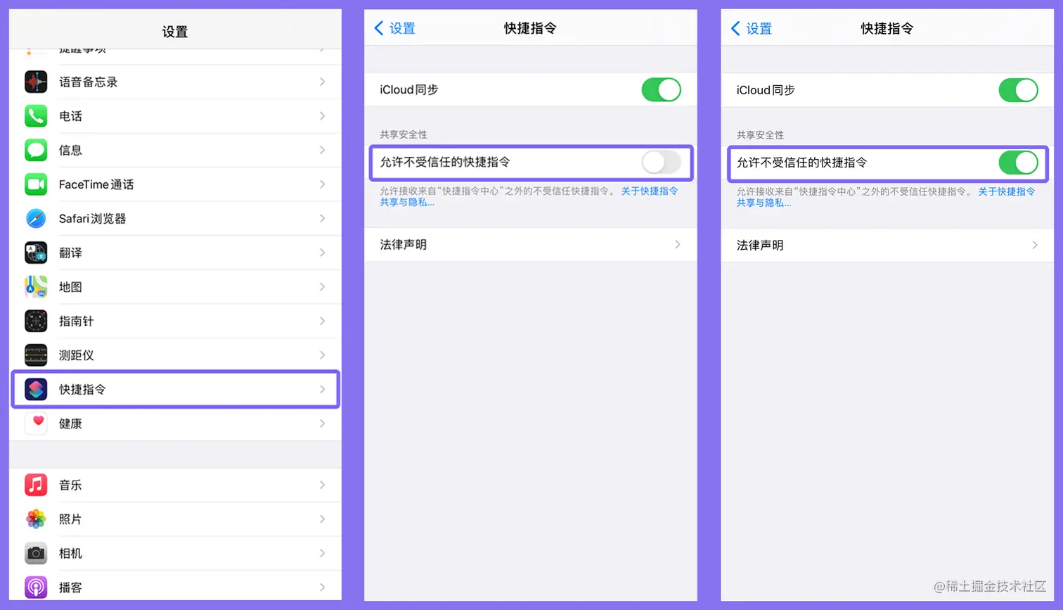 需要在「设置」中的「快捷指令」中打开「允许不受信任的快捷指令」开关👇