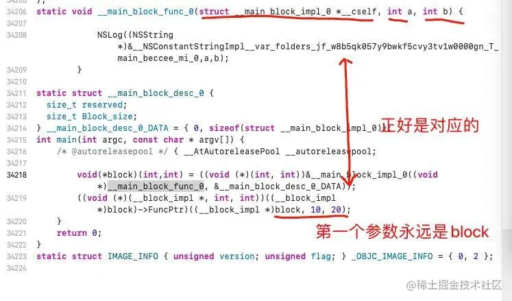 上面的截图一看就是我们刚刚写的那段代码,我们知道变量前面加()一般是强制转换,所以我们可以把上面绿色框框的去掉,看得就比较清晰,剩余如上,最上面的一看就比较简单_main_block_impl_0这个就是创建block的,里面传了2个参数,分别是__main_block_func_0和_main_block_desc这两个东西,而调用block直接就是-->funPtr很大可能就是指针调用,