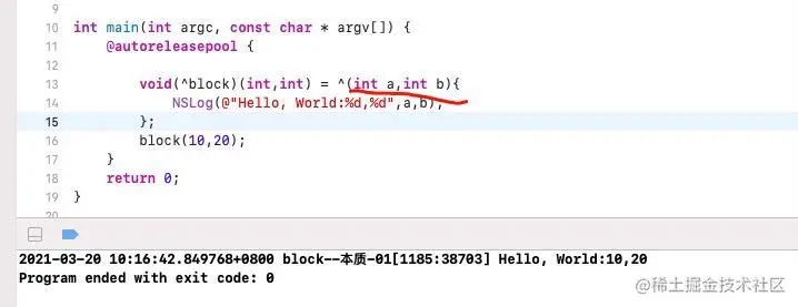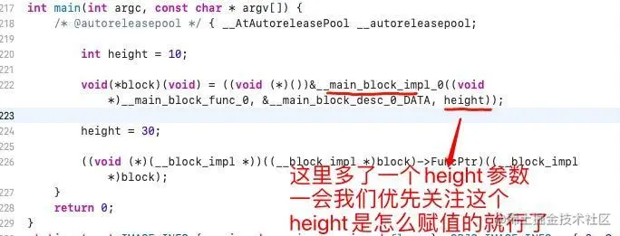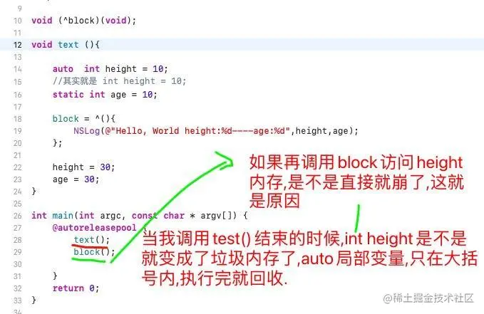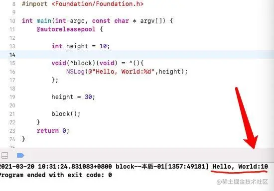 由上面的2张图,我们知道,在执行height=30的时候,block里面的height = 10的,这时候赋值30并没有改变block存储的值是10吧?这里是非常明显,所以我们调用block输出的是hello, World:10,结果非常明显,这就涉及到我们有时候面试官说的,你知道block的变量捕获机制吗(capture).