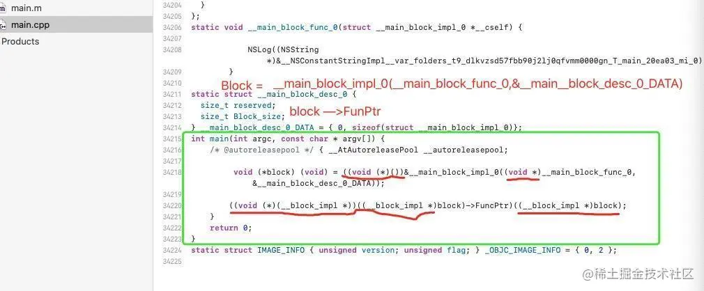 接下来我们把main.cpp文件拉到项目开始查看,看一下源码到底是怎么实现的block,打开这个cpp文件,因为main是最后执行的,所以我们直接划到文件的最下面查看如下: