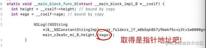 先不说源码,我们是不是可以得出一个结论,auto和static修饰的局部变量都是可以被block捕获吧!这个很清楚.而age传递是啥是&age,是传递的age的指针地址啊,赋值什么都是取的是指针地址,我们再看一下取值是啥: