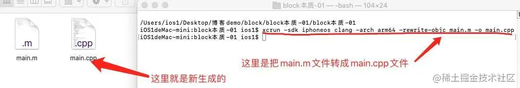 这一个简单的block,我们先用终端把main.m这个文件转成c++代码,我们知道,oc的底层就是c++和c,所以我们利用终端执行下面的操作,把main.m转成c++来看看如下: