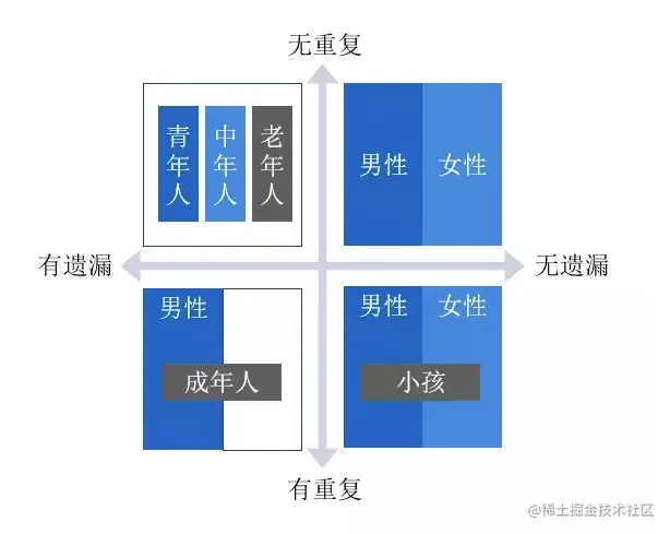 比如对客户的分类如果按男和女来分,的确是满足MECE原则,但仅仅这么分对于我们的营销策略有什么帮助吗?不管走到哪一步,请时刻记住【以终为始】!从营销的角度来看,你可能还要按职业、收入、年龄、居住区域等要素进一步细分,才有可能得出你想要的东西。
