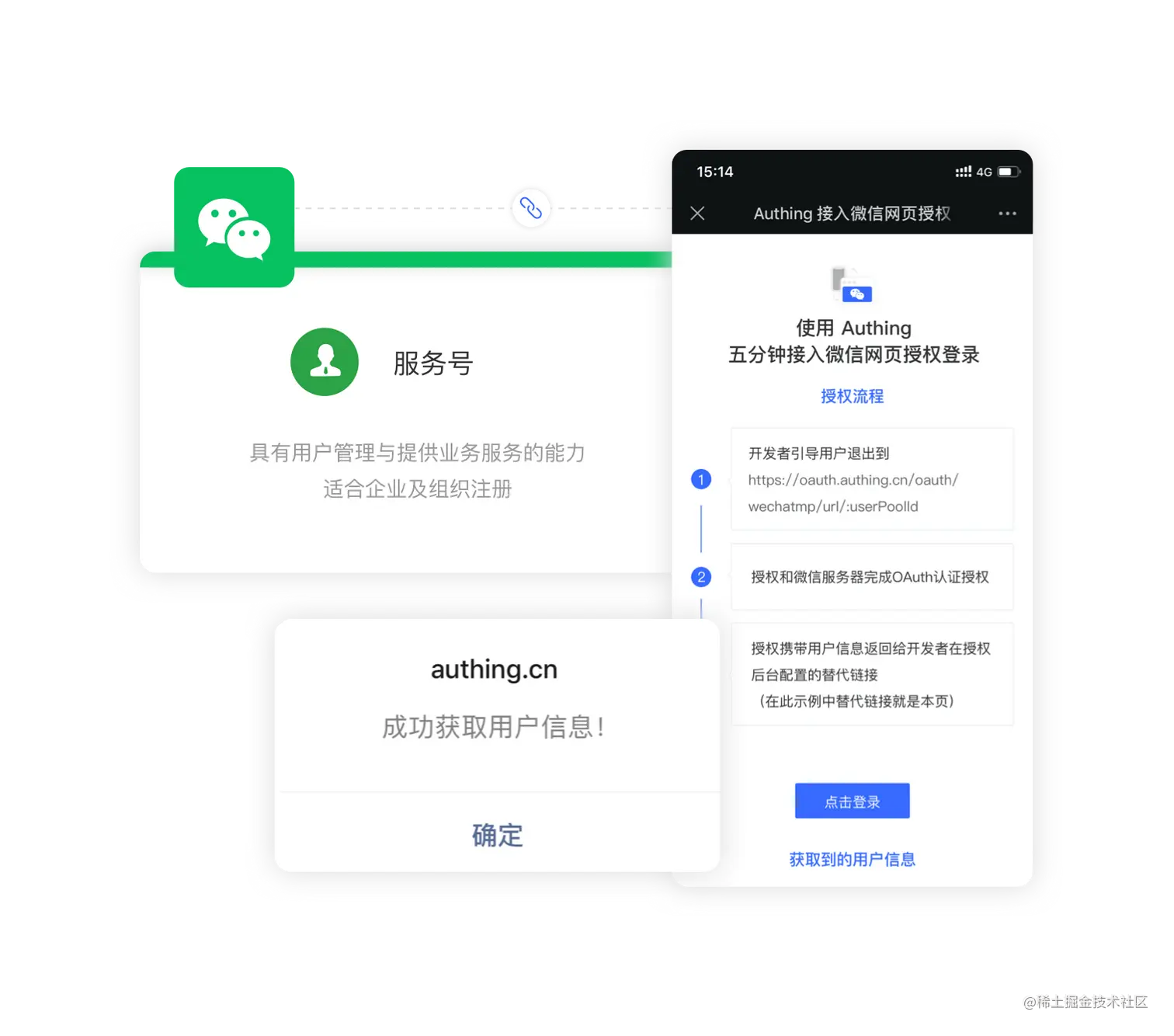 Authing 通过 SDK 为开发者提供了一种快速在微信网页中获取用户信息并完成登录的方法。如果用户在微信客户端中访问第三方网页、公众号可以通过微信网页授权机制,来获取用户基本信息,进而实现业务逻辑。