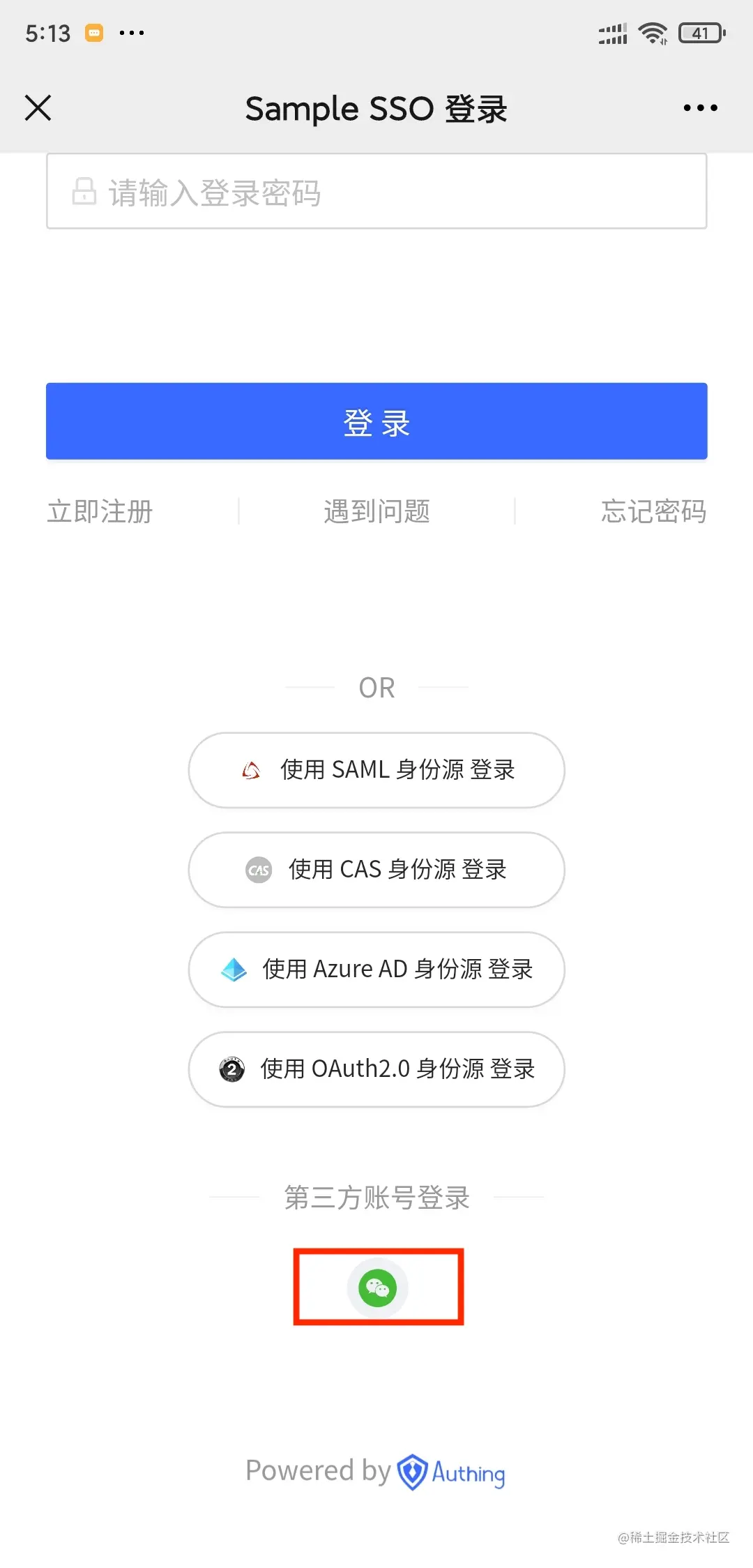 初始化完成后在微信中打开页面会见到如下按钮,点击即可进行授权,授权完成后会跳转到应用回调链接,且可使用 AuthenticationClient 获取用户信息。