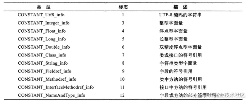 - 方法的名称和描述符 常量池的每一项常量都是一个表,一共有如下表所示的11种各不相同的表结构数据,这每个表开始的第一位都是一个字节的标志位(取值1-12),代表当前这个常量属于哪种常量类型。