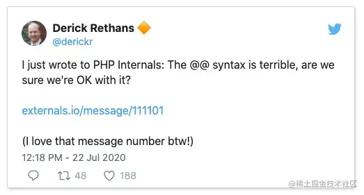 目前,PHP的属性之概念仍然不断进化,虽然已经定下从<<FooAttribute到@@FooAttribute,但是资深开发者 Derick Rethans 在Twitter上用一个简单的“我们真的接受这样的属性写法吗?”他表示强烈质疑属性的符号定义。