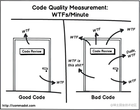 每个人的性格、技术水平和工作经历都不一样,看待“好代码与烂代码”的标准也各不相同,下图是一张比较出名的关于在Code Review中评判代码质量的图片