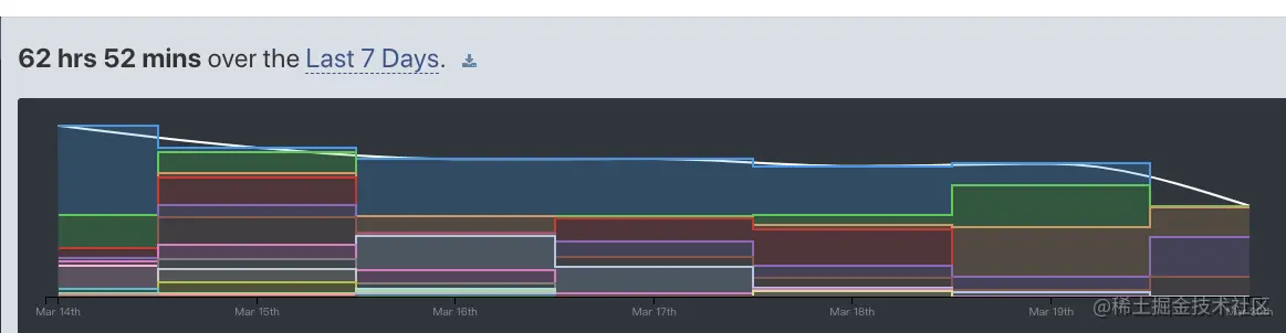 附:最近7天的写代码平均时间(包含工作任务和个人项目代码,主要的是自己的代码哈哈,最近公司的活比较少),来源waka统计