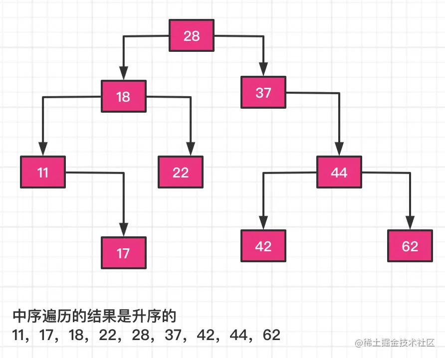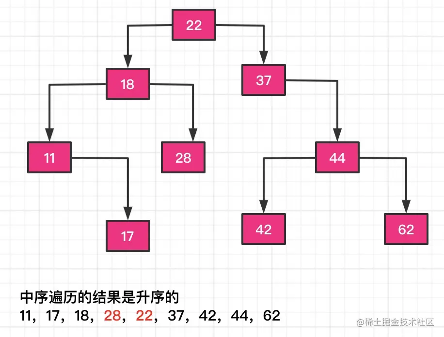 二叉搜索树中序遍历的结果是一个递增的数组;正常的二叉搜索树中序遍历结果如下图