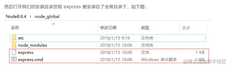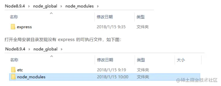 注:如果安装时不加 -g 参数,则安装的模块就会安装在当前路径下,上例若不加 -g 参数,则 express 模块会安装在 C:\Users\yi081目录下的 【node_modules】目录下,目录若不存在会自动生成。