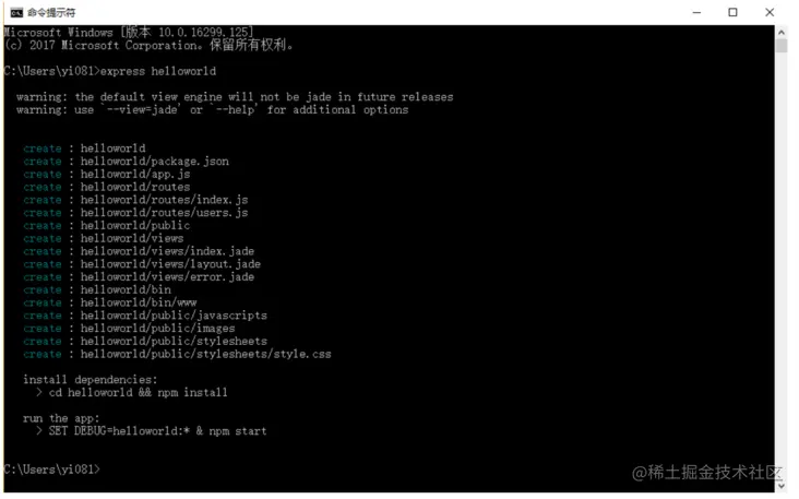最后查阅网上资源后,原来,最新express版本中将命令工具分家出来了(项目地址:github.com/expressjs/g…),所以还需要安装一个命令工具,命令如下: