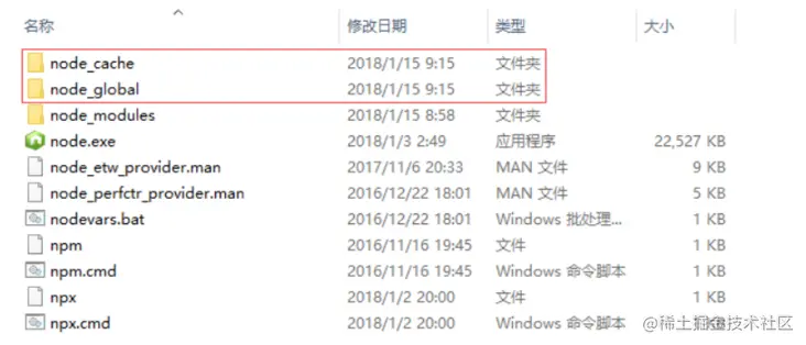 例如:我希望将全模块所在路径和缓存路径放在我node.js安装的文件夹中,则在我的安装目录下创建两个文件夹【node_global】及【node_cache】如下图:
