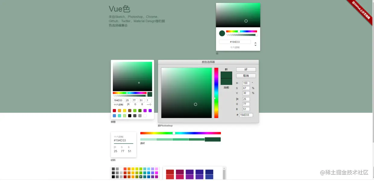 **Vue-Color **是来自Sketch,Photoshop,Chrome,Github,Twitter,Material Design等众多酷炫色彩选择器的集合。
