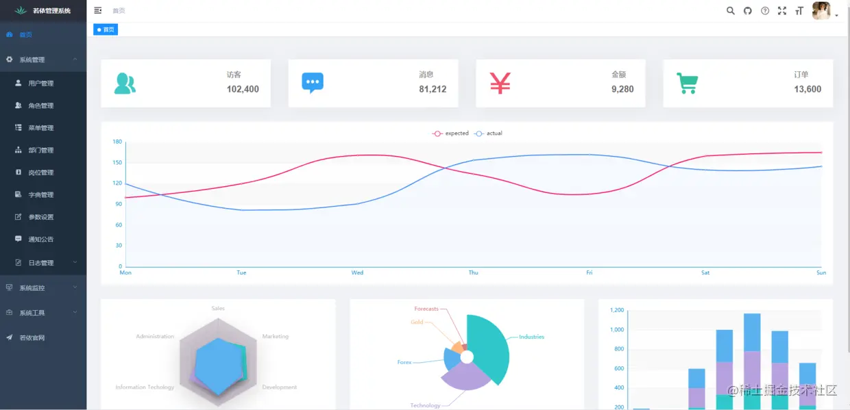 - 前端采用Vue、Element UI。* 后端采用Spring Boot、Spring Security、Redis & Jwt。* 权限认证使用Jwt,支持多终端认证系统。* 支持加载动态权限菜单,多方式轻松权限控制。* 高效率开发,使用代码生成器可以一键生成前后端代码。* 提供了一个Oracle版本RuoYi-Vue-Oracle,保持同步更新。* 感谢Vue-Element-Admin,eladmin-web。* 不分离版本,请移步RuoYi,微服务版本,请移步RuoYi-Cloud