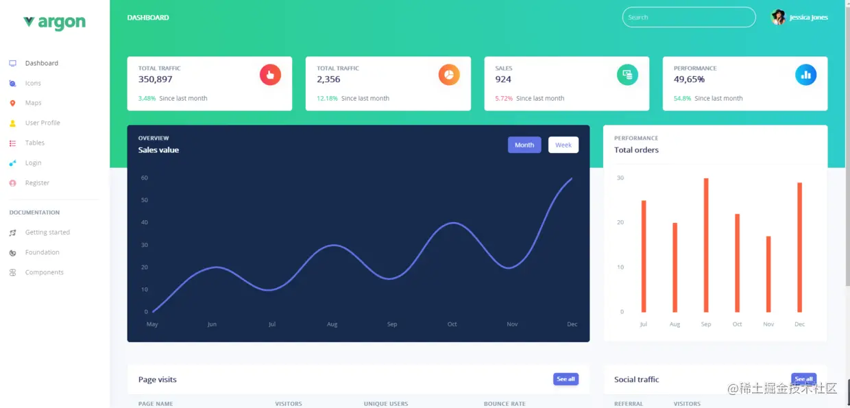 **Vue Argon Dashboard **是Bootstrap 4和Vue.js的仪表板。它是开源的,免费的,并且具有许多组件,可以帮助您创建出色的网站。Vue Argon仪表板内置了100多个单独的组件,因此您可以选择和组合。由于实现了所有元素,因此从原型制作到功能齐全的代码,您将节省大量时间。该仪表板附带了预先构建的示例,因此开发过程是无缝的,从我们的页面切换到真实的网站非常容易。