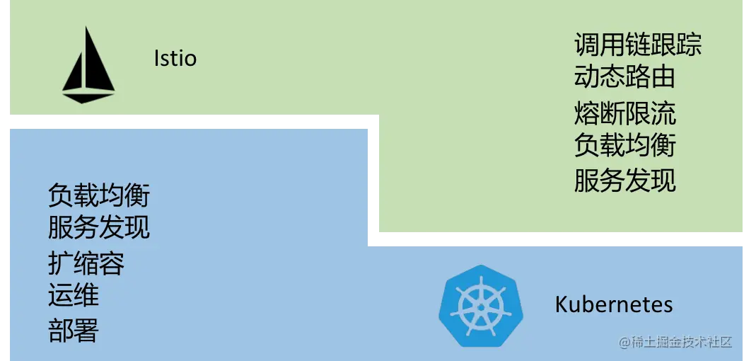 对K8s来说,Istio是以插件的形式对K8s的一种功能补齐,K8s本身只实现了运维部署、基本的服务发现等基础层,Istio则是在其之上,业务层之下,处于中间的平台层,实现了以上的服务治理能力