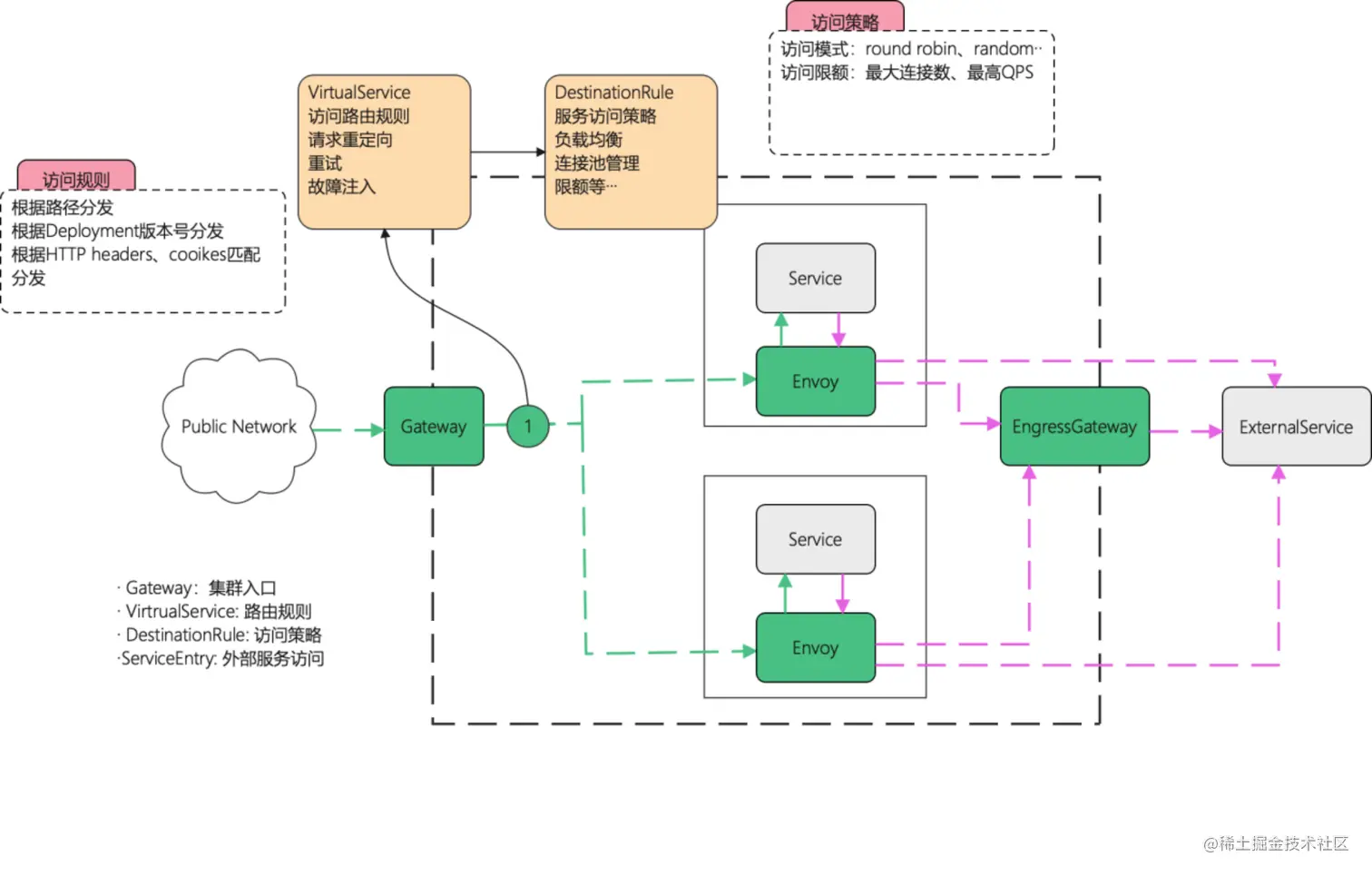 - DestinationRule: 访问策略的规则,比如过滤目标节点,设置负载均衡模式等,可以理解为Nginx下的upstream配置,server.location匹配到规则后就会向指定的upstream发起请求,而DestinationRule就相当于upstream下的各种控制规则,比如定义后端服务列表,定义最大连接数等