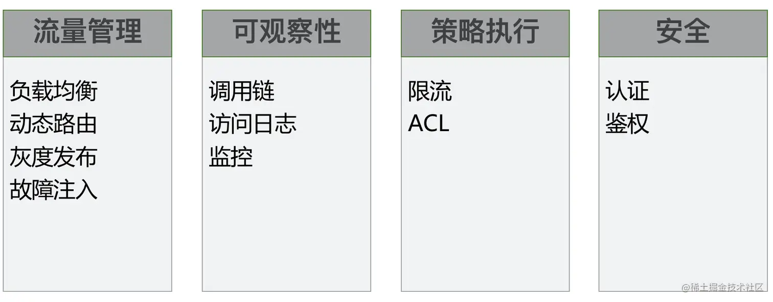 - 实现负载均衡,动态路由,同时能够支持灰度发布、故障注入等高级的治理能力