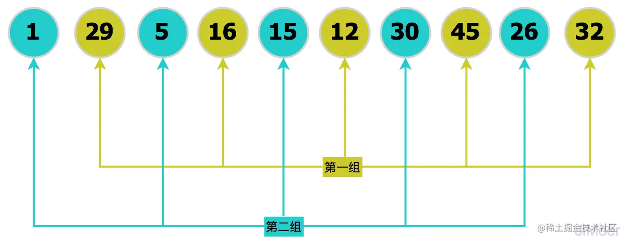 gap=array.length/2=5分组后,将原数据分为了5组,[12,1]、[29,30]、[5,45]、[16,26]、[15,32]。
