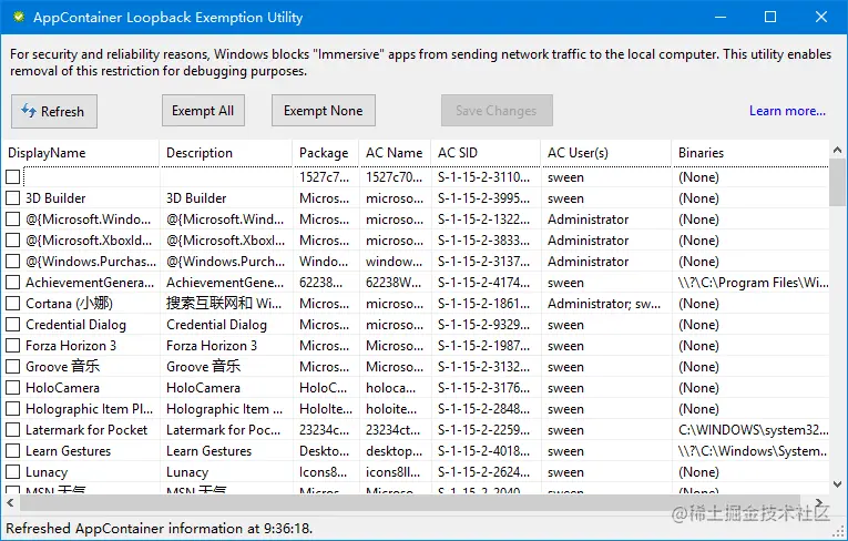 如果你觉得这种方法太麻烦,可以在 这里 下载免费网络调试工具 Fiddler,然后从顶部菜单中选择「WinConfig」,在接下来打开的窗口中勾选你想排除网络隔离的应用就可以了。