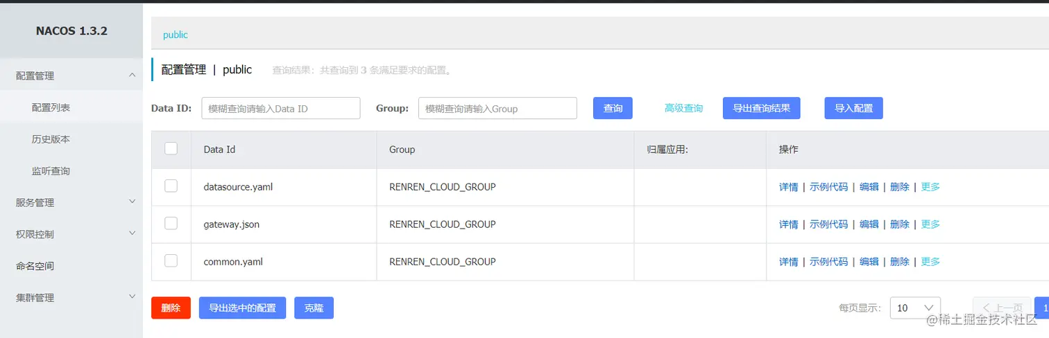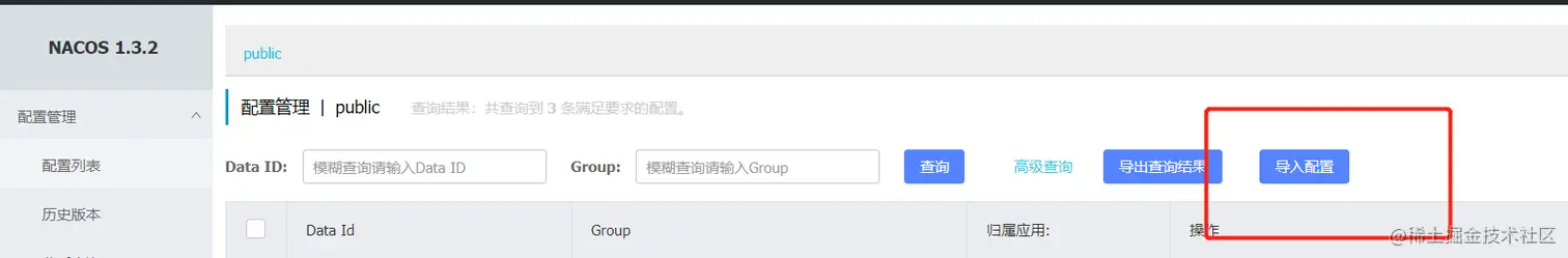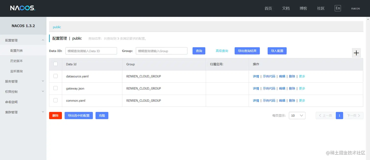 Nacos支持导入配置,可以直接将配置文件压缩包导入,这里我们以人人开源的微服务项目为例