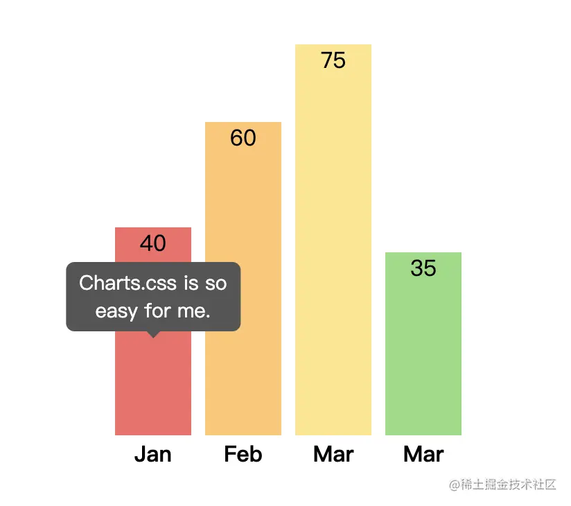 在上面这个例子,我们在第一条的柱形上添加了一个 hover 展示额外的信息(Charts.css is so easy for me.)的效果。