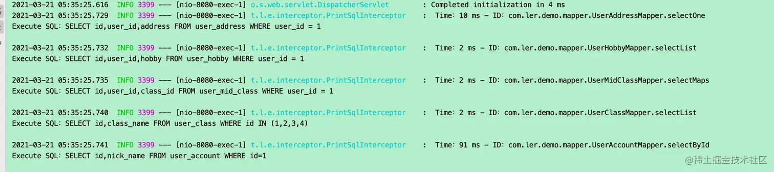 可以看到其实发送了好几条SQL。第一条是userAccountService.getById(1L),后面几条都是自动发送的。