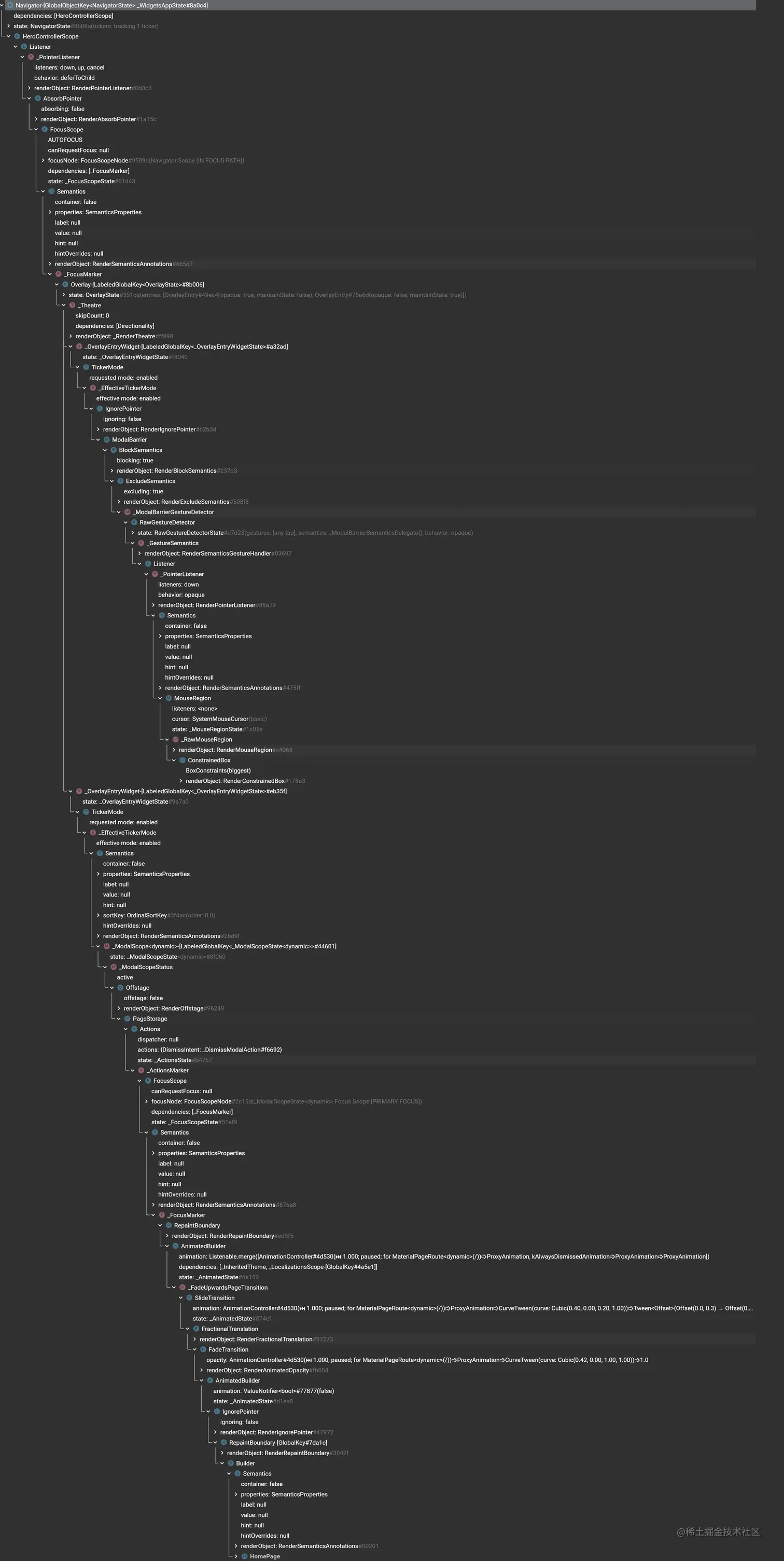 在深入 push() 方法之前,我们先借助 devtools 了解一下 Flutter 页面的层级结构,能够帮助我们更好地理解下面的流程。