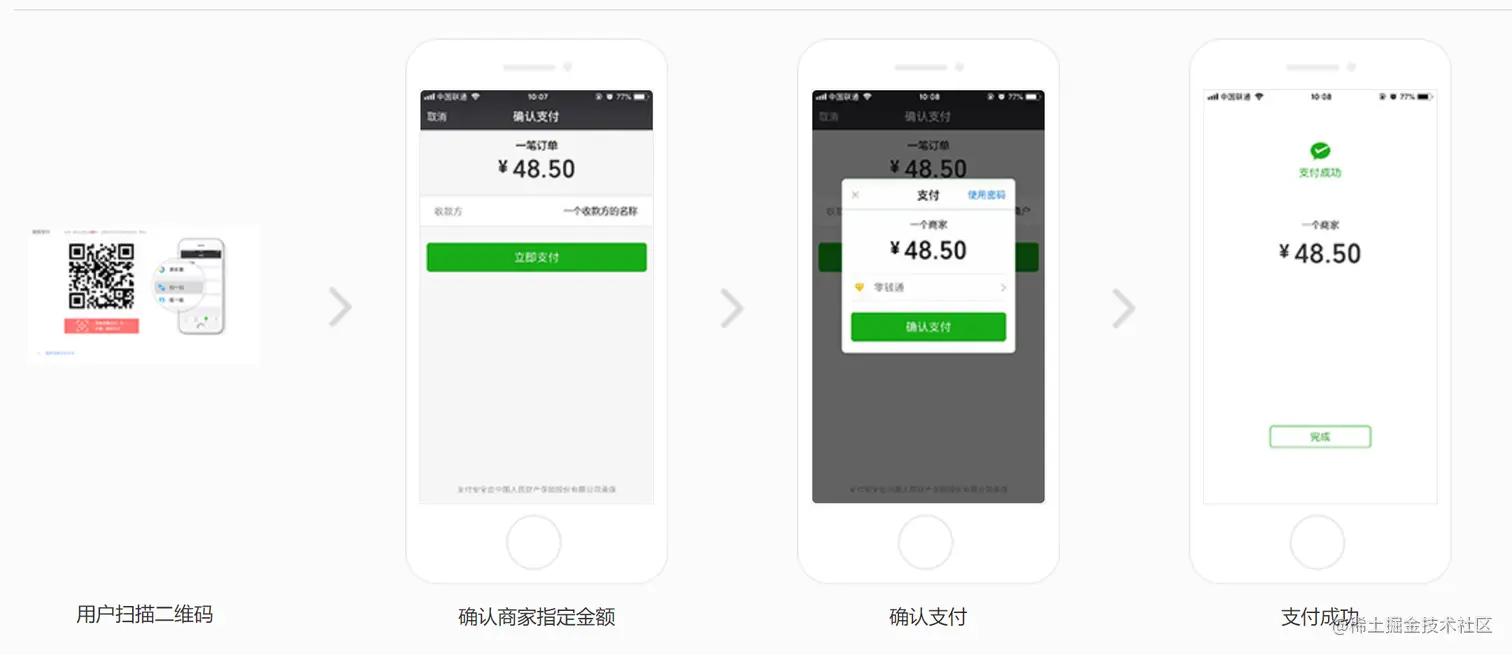 商家在系统中按微信支付协议生成支付二维码,用户扫码拉起微信收银台,确认并完成付款