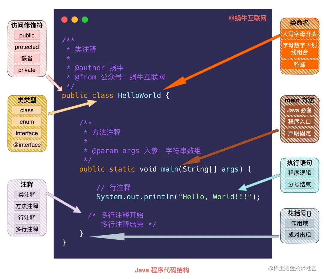 其实我们上篇提到的 HelloWorld 程序就是一个完整的 Java 程序,它由访问修饰符、类类型、类命名、main 方法、执行语句、花括号和注释这几个核心要素构成。