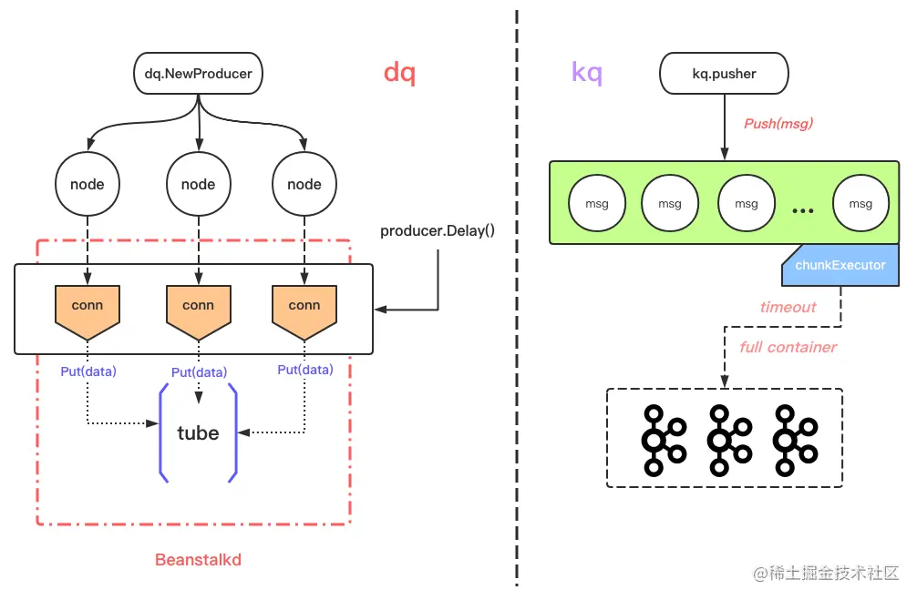 dq:依赖于beanstalkd,适合延时、定时任务执行;kq:依赖于kafka,适用于异步、批量任务执行;