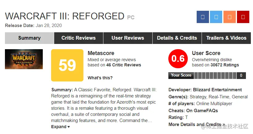 这也不得不cue一下暴雪近年来在新游戏上的表现。自打《魔兽争霸》问世以来,在Metacritic(电玩界最重要、最受玩家信赖的电子评分)上的评分都是居高不下。**曾经的《魔兽争霸3:混乱之战》和《魔兽争霸3:冰封之王》的评分都是9.2。不过《魔兽争霸3 重制版》去年出来就直接打破最低Metacritic上游戏评分的最低纪录—**0.6分,也是暴雪娱乐出品有史以来的最低分(估计也很难打破了)。