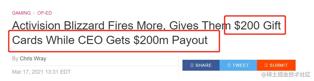 翻译:暴雪的这些裁员补偿,可以让被裁的员工们在失业期间继续购买《守望先锋》皮肤,**帮助CEO的奖金更上一层楼(奖金高达2亿美元),黑心老板实锤!**这也让$200美元得礼品卡调侃更加停不下来。被裁的员工心里就一个字:惨 !