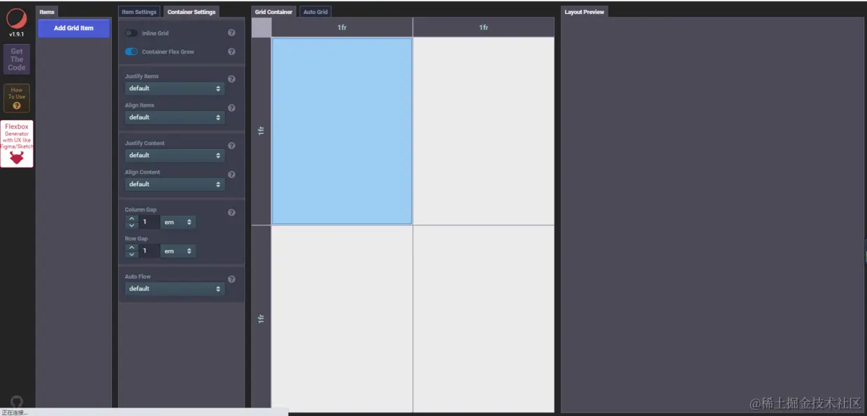 Dmitrii Bykov编写的CSS Grid Layout Generator是免费的,可以在线访问,并且非常灵活。我试了一下,发现它在网格容器级别和网格项目级别上给了我很多控制,同时为我提供了不错的预览功能和简洁的代码。
