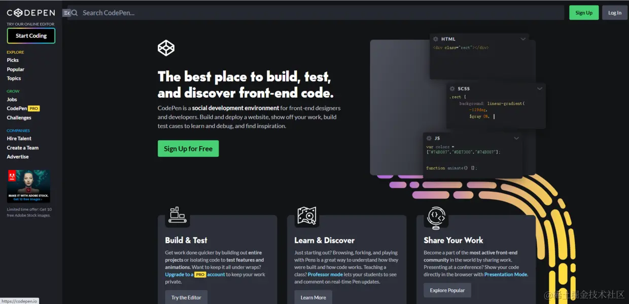 CodePen已经存在了很多年,并且受到前端开发人员社区的喜爱和广泛使用。由Chris Coyier和Alex Vazquez共同创建,对于尝试概念,原型设计,学习代码和代码共享而言,这是惊人的。它由其团队定义如下: