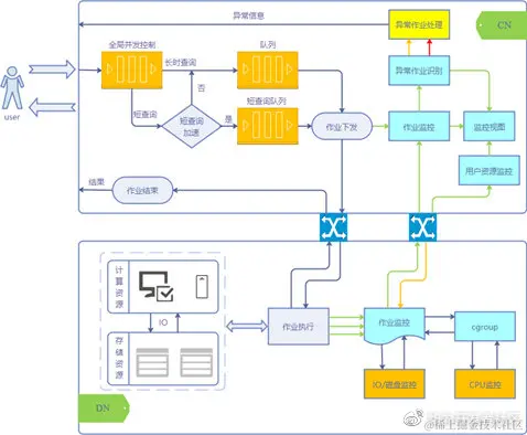 资源管理主要包含并发控制、资源管控、资源监控以及异常作业处理。并发控制主要分为全局并发控制和资源池并发控制,其中资源池并发管控由快慢车道实现,快车道管控简单作业,慢车道管控复杂作业,支持自动识别和手动切换快慢车道,理论上快车道并发大、作业运行时间短、占用资源少;慢车道并发少、作业运行时间长,占用资源多。
