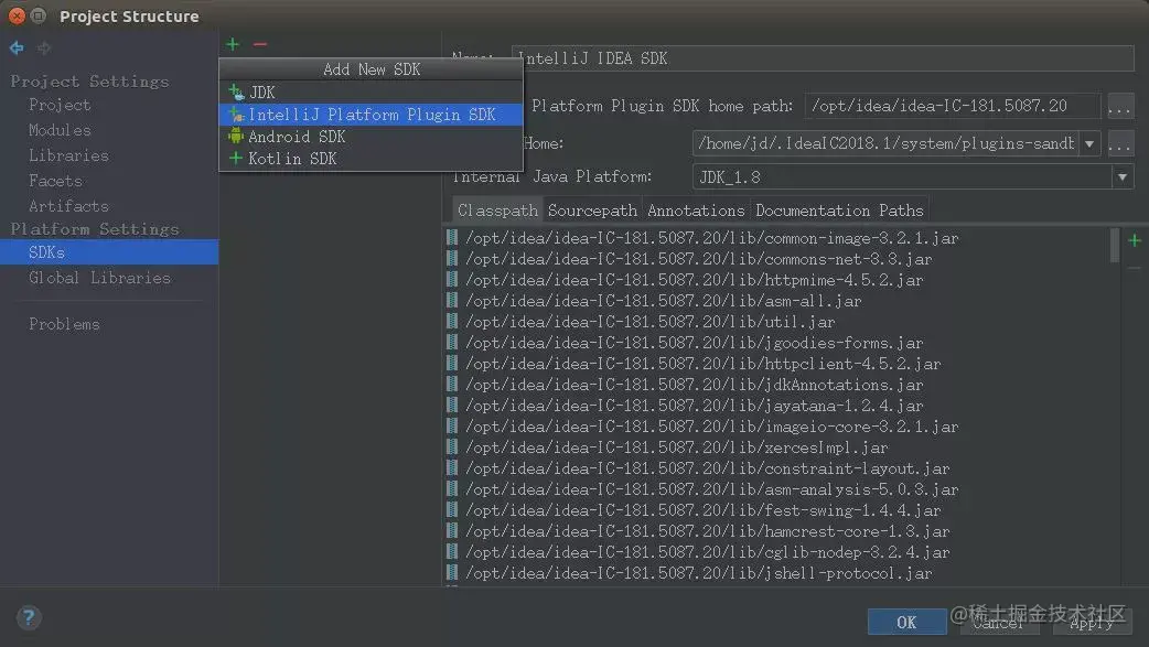 - 点击 + 按钮,先选择 JDK,指定 JDK 的路径;再创建 IntelliJ Platform Plugin SDK,指定 home path 为 IDEA 的安装路径,如图: