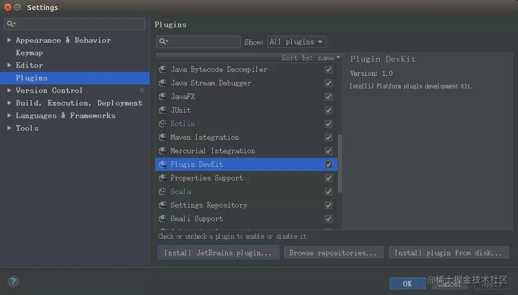 打开 IDEA,导航到 Settings | Plugins,若插件列表中没有 Plugin DevKit,点击 Install JetBrains plugin,搜索并安装。