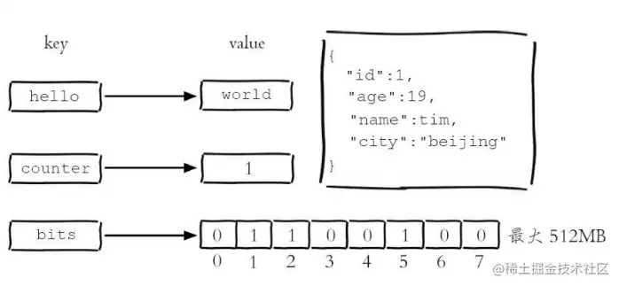 - 字符串类型的值,可以是简单的字符串或json,xml。可以是数字(整数,浮点,内部会转换),可以是二进制(图片,音频,视频)