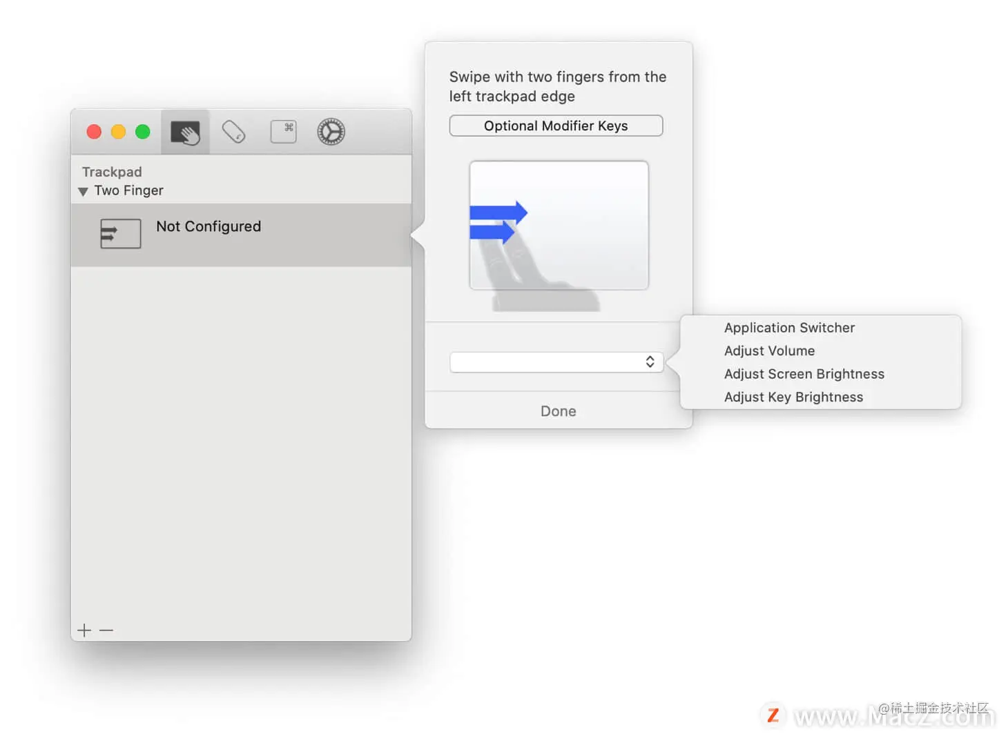 两指从 trackpad 面板的左侧边缘向右滑动,同时可选设置 Fn 键,此时可以选择的任务有 app switch 切换、调整 Mac 音量、调整 Mac 屏幕亮度、调整键盘背光板亮度。