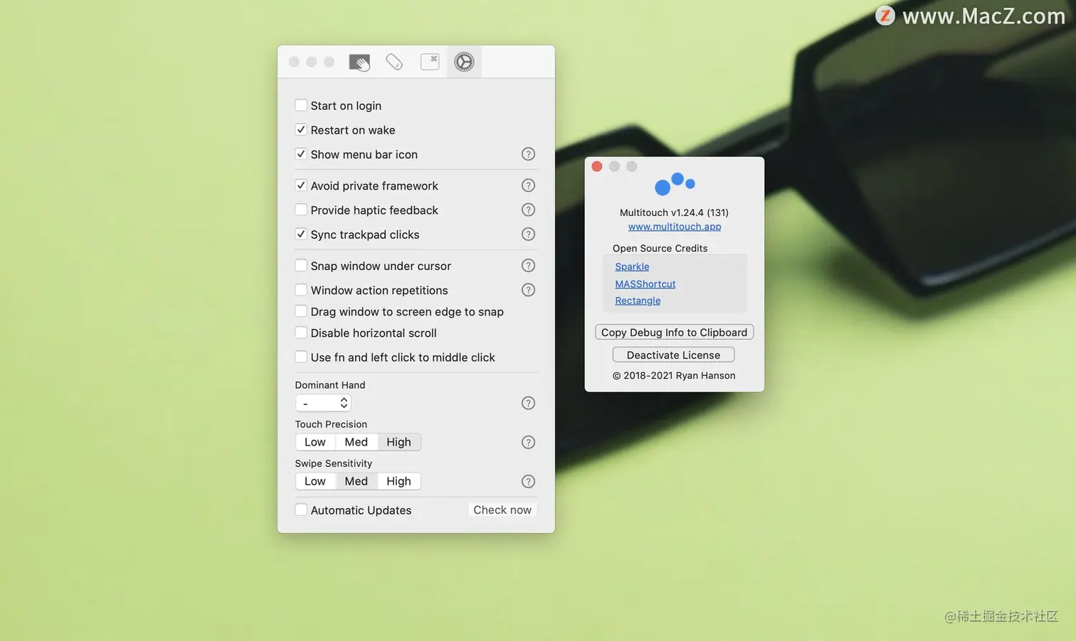 Multitouch 是一款性能强大的 macOS 手势控制自定义软件,你可以在 trackpad、magic mouse 上定义一指、二指,三指,四指,五指,Force Touch 的各种动作,像:点击(Click)、轻拍(Tap)、轻扫(Swipe)及各种组合动作,通过这些动作你可以设定千奇百怪的功能,大致分为快捷键(shortcuts)、文本扩展(expander)、macOS 自带功能键、鼠标左右键点击、窗口管理、浏览器标签页管理、执行命令行等等任务,可谓是手势控制界的 Keyboard Maestro。